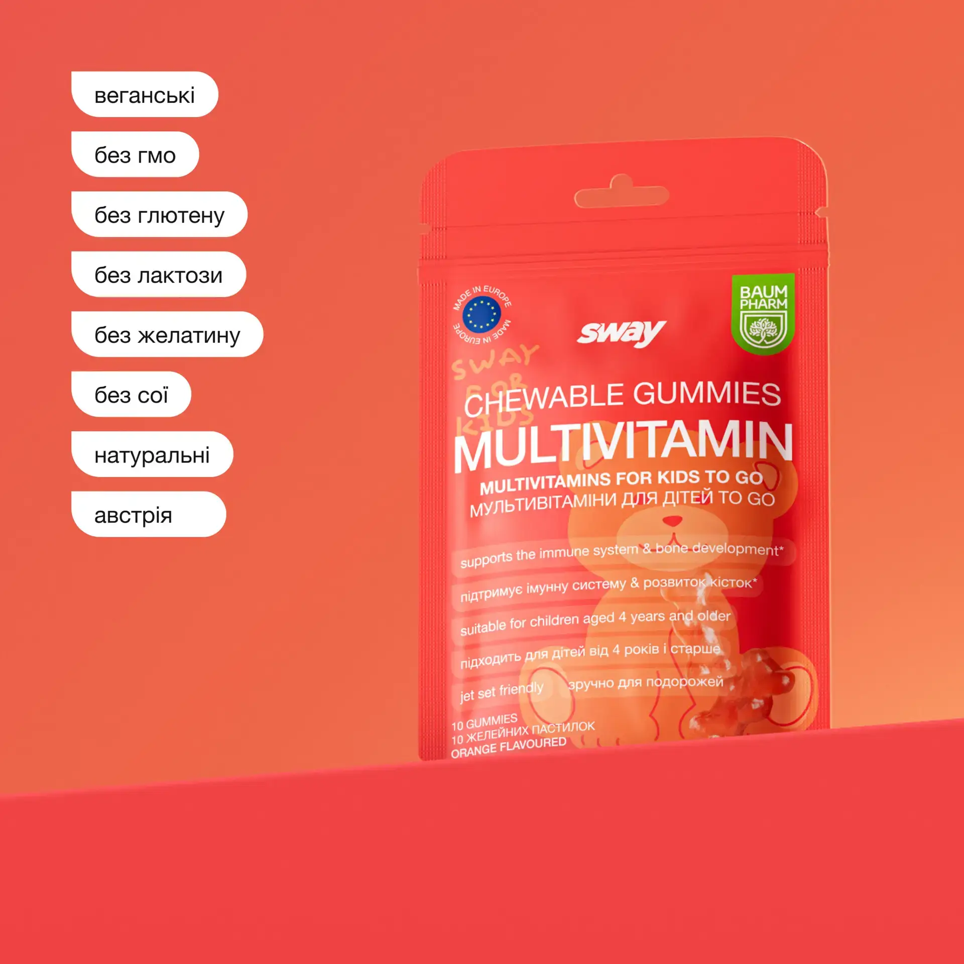 Glucose syrup, sugar, water, gelling agent (pectin), acidulant (citric acid), Vitamin E, Vitamin C, acidity regulator (sodium citrate), coconut oil, Vitamin D, zinc citrate, colorant (paprika extract), natural aroma, iodine, Vitamin A, Vitamin B6, pantothenic acid, anti-caking agent (carnauba wax), Vitamin B12, folic acid, D‑biotin.