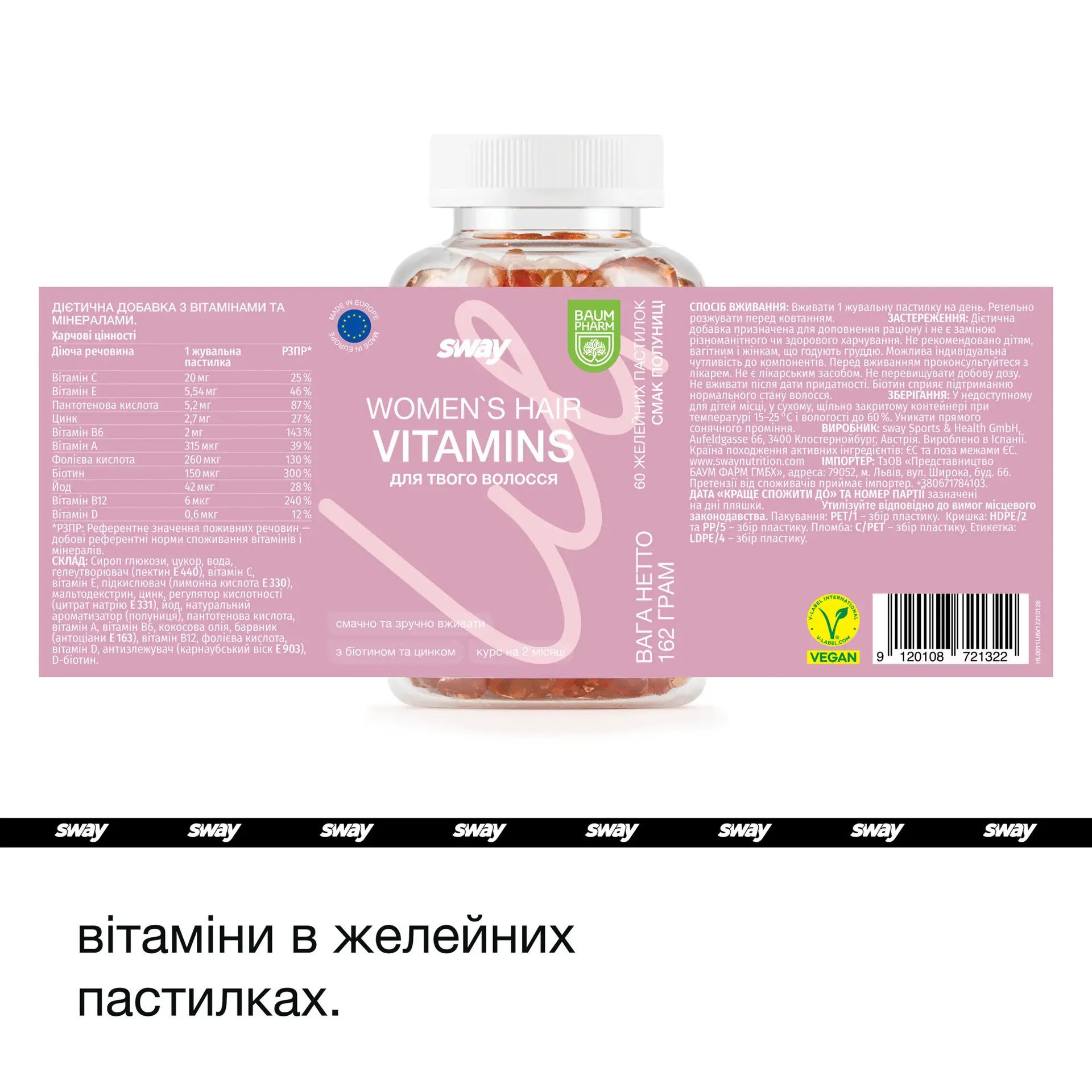 Women’s Hair Vitamins provide an essential blend of hair-supporting nutrients, including 42 μg of biotin (28% NRV), 5.2 mg of pantothenic acid, and 2 mg of zinc (143% NRV) to promote growth, strength, and shine. Biotin plays a key role in keratin production, helping to reduce hair thinning and split ends, while zinc contributes to scalp health and hair follicle maintenance. Vitamin C (25% NRV) and vitamin E support antioxidant protection, preventing damage from oxidative stress. Additionally, iodine and vitamin B12 help regulate metabolic functions that impact hair growth, ensuring stronger, healthier hair. Unlike traditional hair supplements, these gummies provide a tasty, convenient way to support vibrant hair without artificial additives.