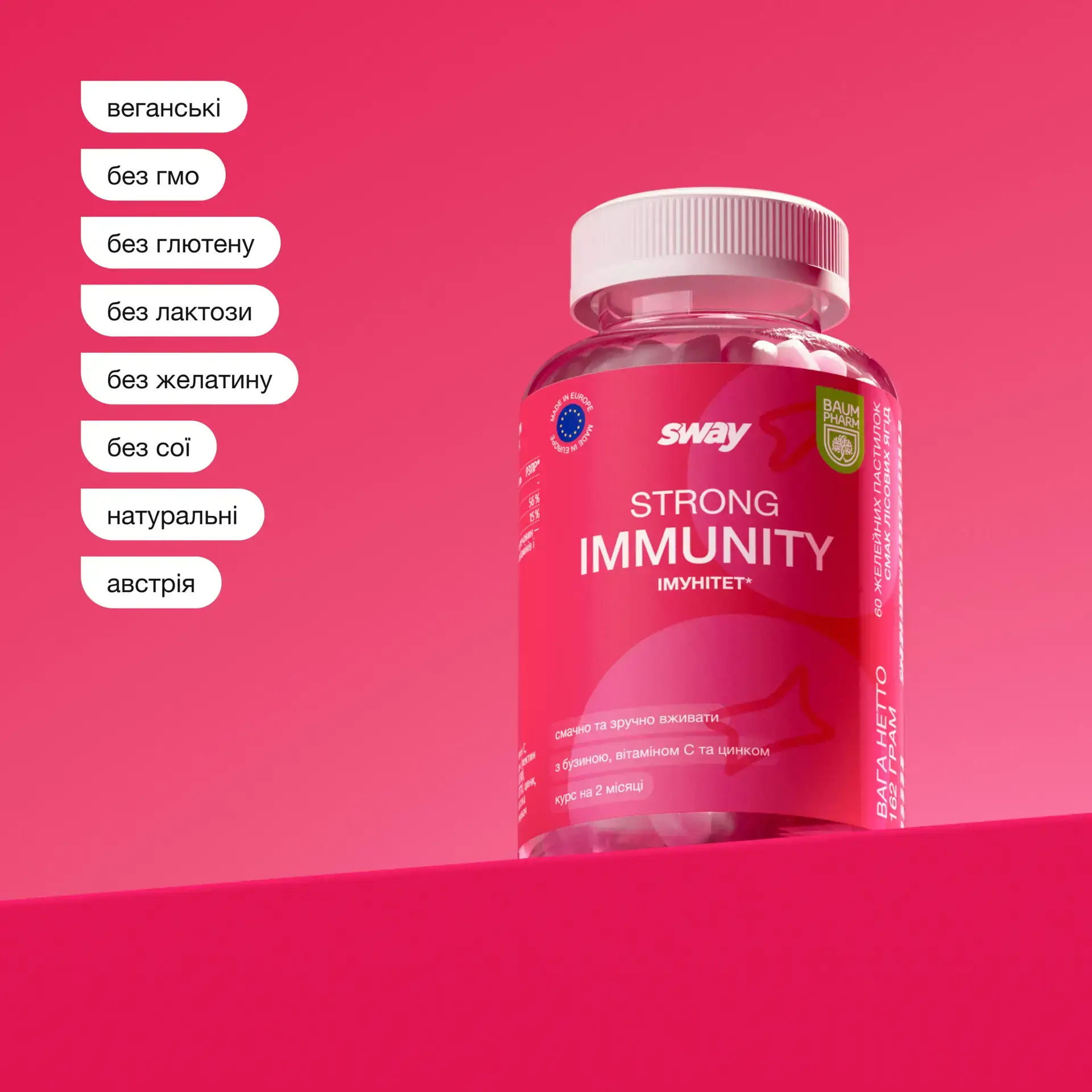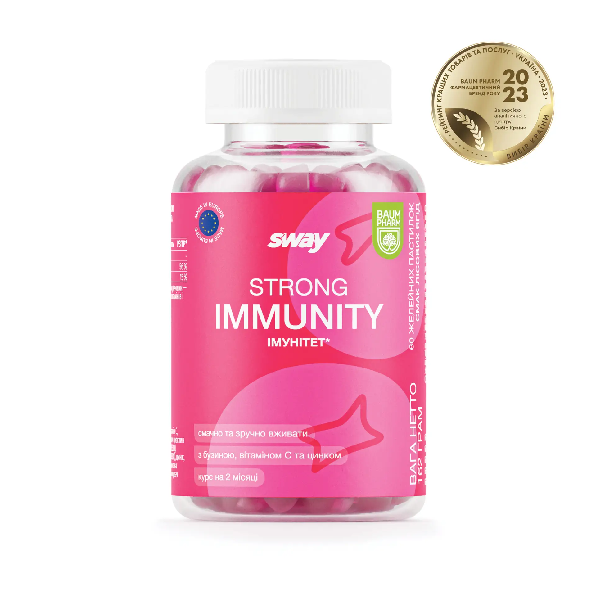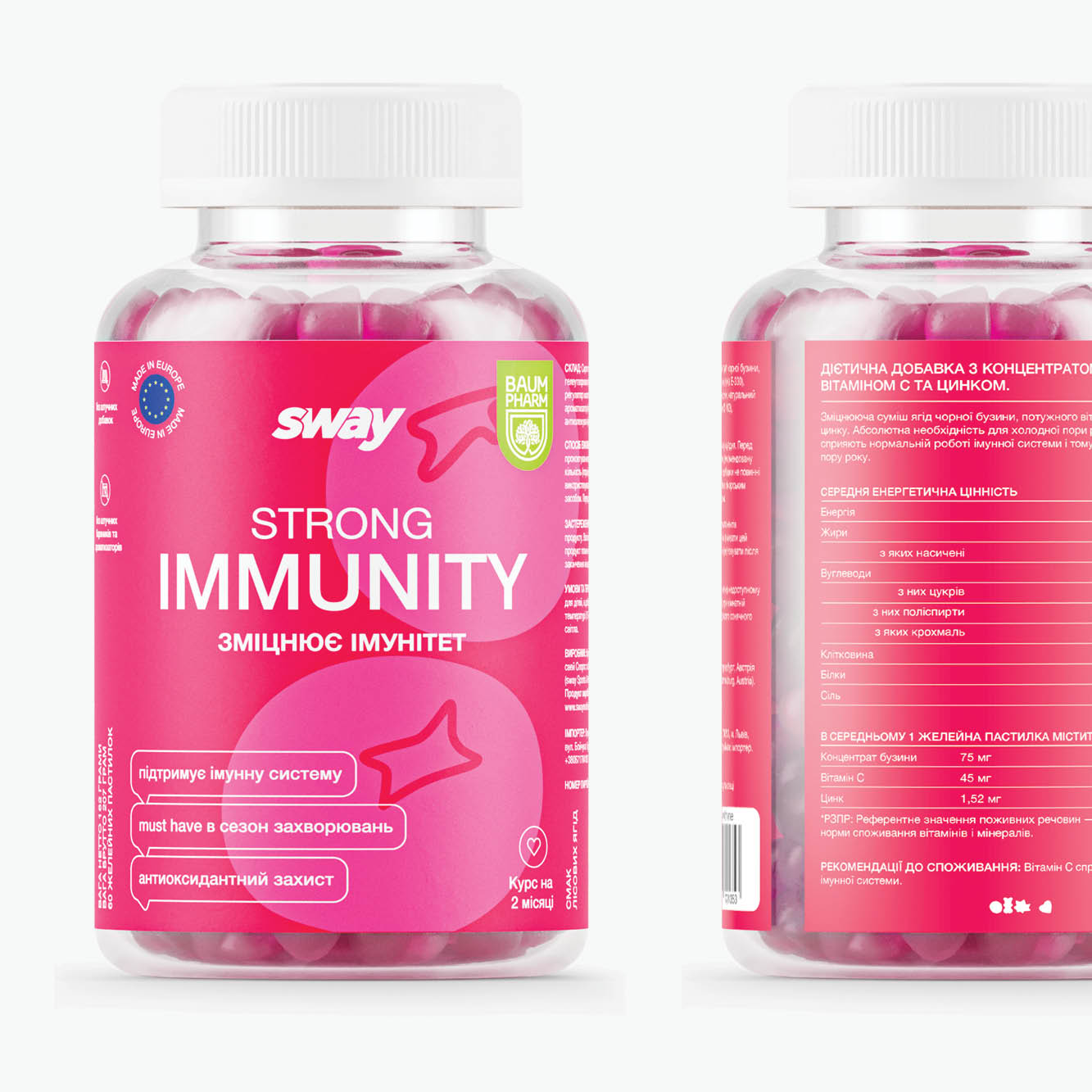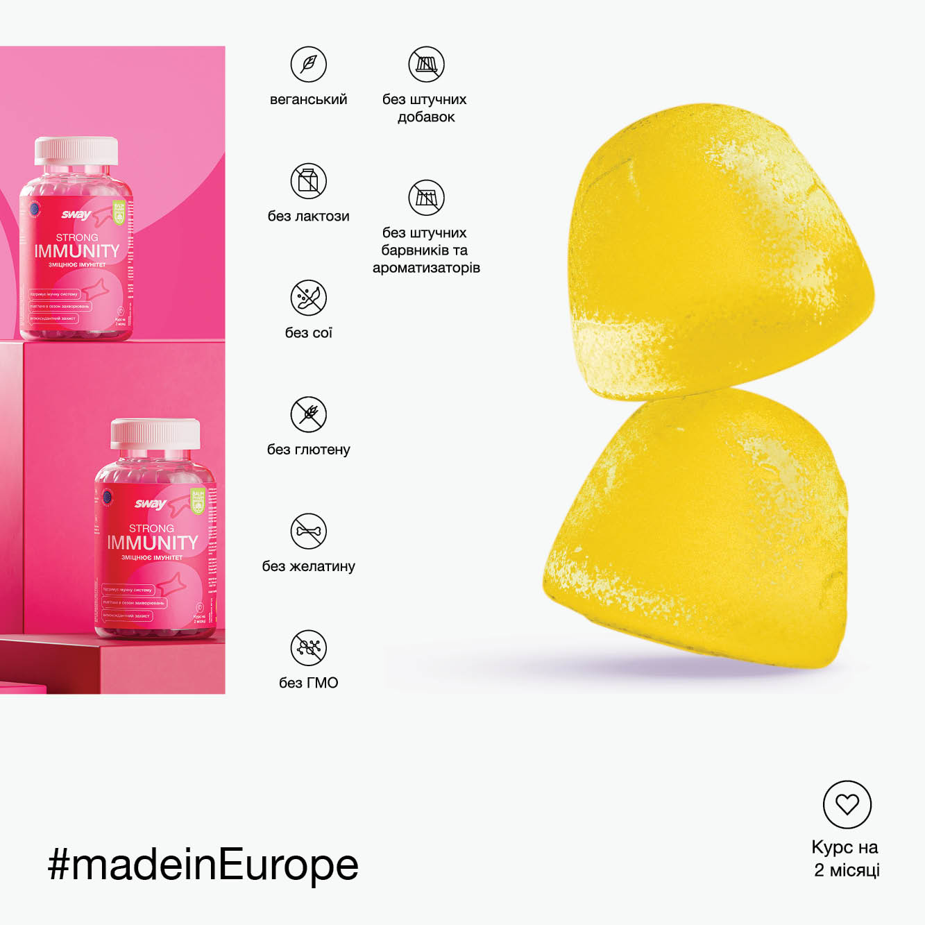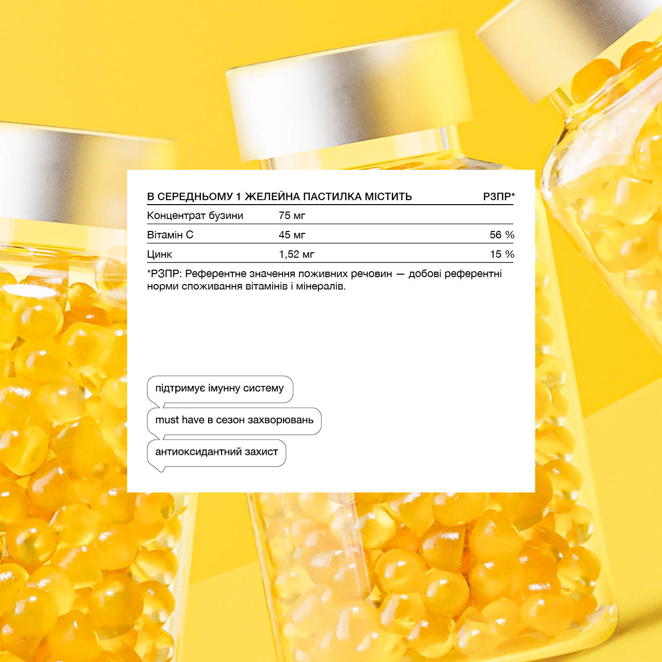 Сильний імунітет поєднує в собі бузину, вітамін С і цинк у смачній желейці для підтримки імунного захисту та загального самопочуття. Ця потужна суміш допомагає зміцнити природний імунітет, захищає від оксидативного стресу та підтримує ваше самопочуття на висоті – без потреби в таблетках чи сиропах.