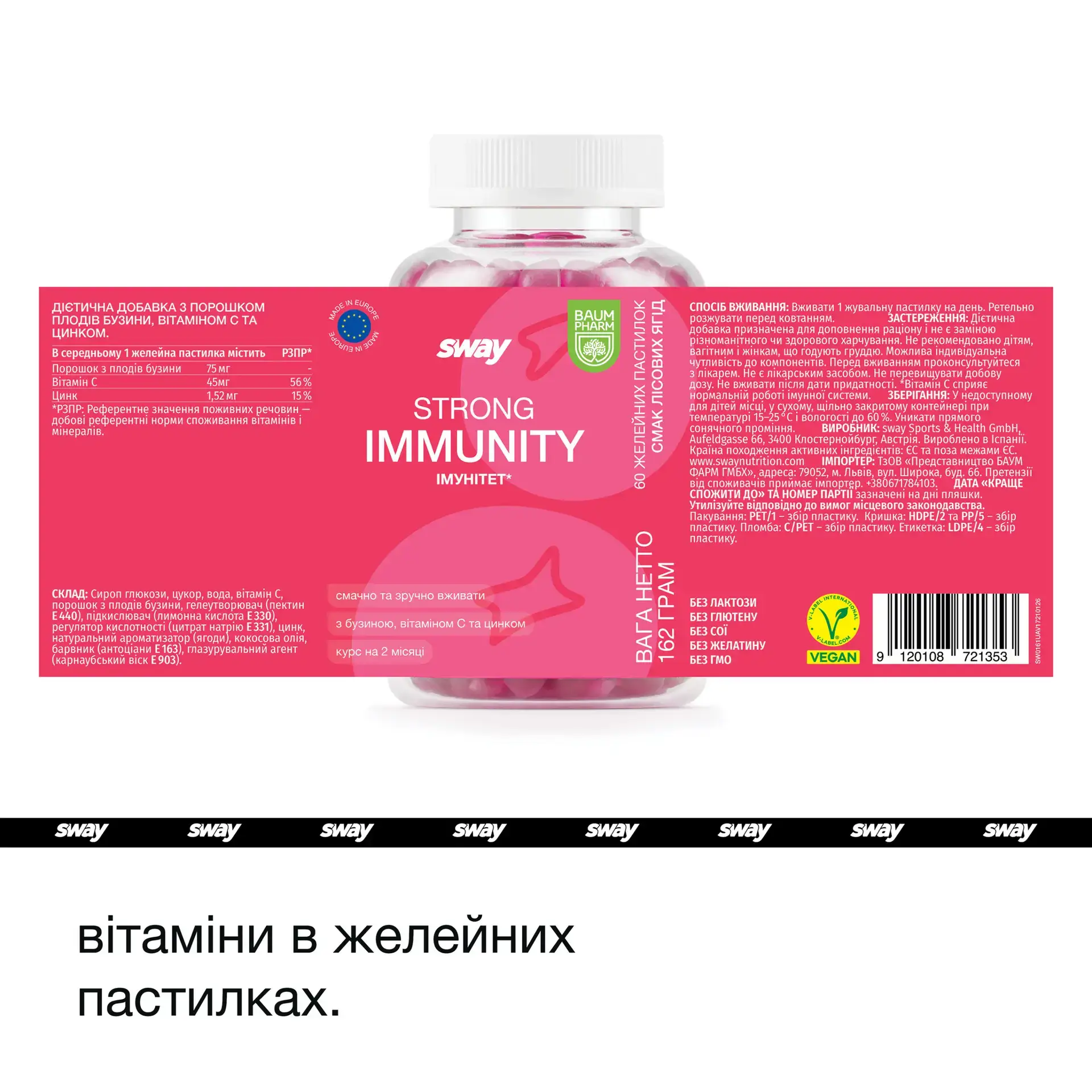 Сильний імунітет містить 75 мг концентрату бузини, 45 мг вітаміну С та 1,52 мг цинку на одну желейку, створюючи потужну комбінацію для підтримки імунного захисту та загального стану здоров’я. Бузина багата на антиоксиданти і століттями використовувалася для зміцнення імунітету. Вітамін С допомагає захистити клітини від окислювального стресу, а цинк відіграє вирішальну роль в імунній функції та відновленні. На відміну від традиційних імунних добавок, ці веганські желейки – зручний і смачний спосіб залишатися захищеними цілий рік – без штучних добавок.