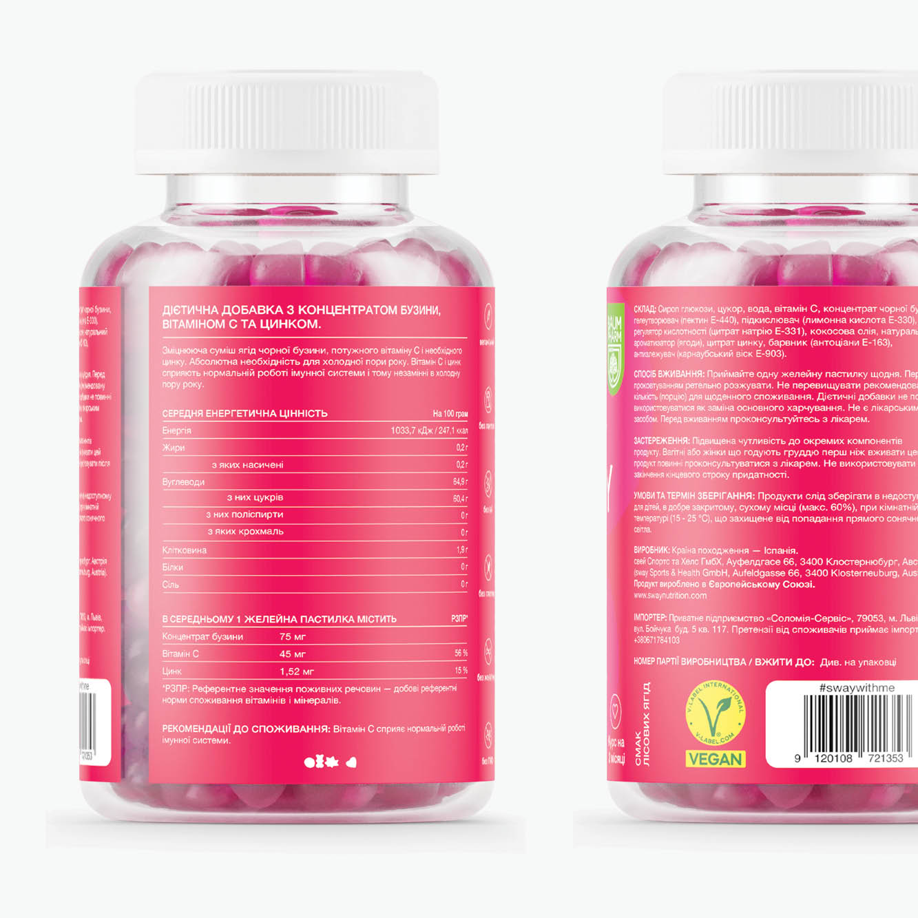 Глюкозний сироп, цукор, вода, вітамін С, бузина чорна, желюючий агент (пектин), підкислювач (лимонна кислота), регулятор кислотності (цитрат натрію), кокосова олія, натуральний ароматизатор, цитрат цинку, барвник (антоціани), антизлежувач (віск карнауби).